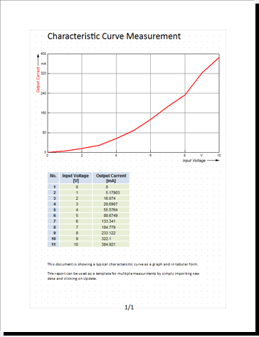 To document the results, you usually set up a table in a spreadsheet where only the relevant data, diagrams, etc. are displayed. To do this, FlexPro has a powerful Document Editor that you can use to create illustrative, multi-page documents.