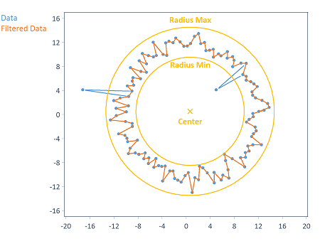 Prior to carrying out the circle approximation, circular outliers can be removed from the data. All data points are removed whose distance from the specified circle center is greater than the adjustable minimum radius and shorter than the adjustable maximum radius: