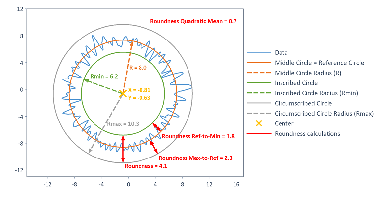In the LSCI method, in addition to roundness deviation, the peak-to-reference roundness deviation (difference between circumscribed circle radius and reference circle radius), the reference-to-valley roundness deviation (difference between reference circle radius and inscribed circle radius) as well as the root mean square of the deviations of the data points to the reference circle are output as statistical parameters (refer to [1]).