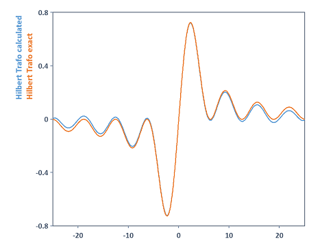If you increase the FFT length in this example for the calculation of the variable hilbTrafo to 131072, for instance, the result in this case is a more precise calculation for the Hilbert transform. Both curves are now almost completely in agreement: