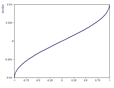 The real inverse sine function is calculated for a real argument. The result then has the 64-bit floating point value data type. The range for Number is then limited to the interval [-1, 1]. For each value of Number outside of this interval, the function returns a void value. The following illustration shows the course of the function in this interval: