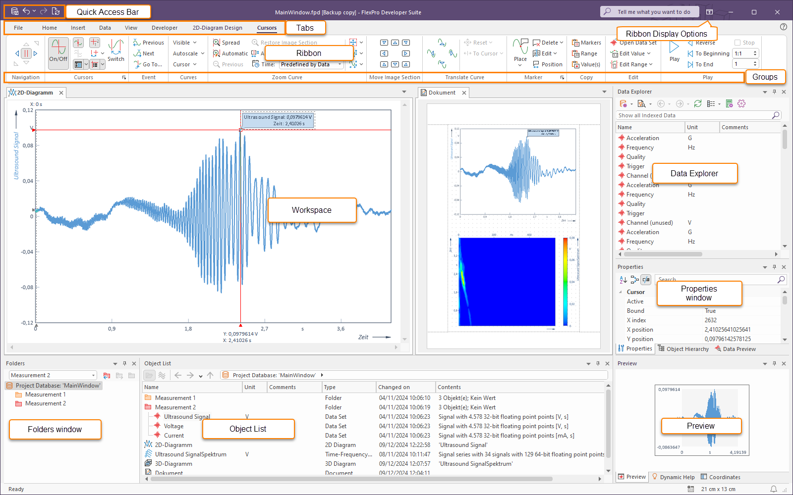 The main FlexPro window shows the data of an open project database and offers you options for navigating and searching within the project database as well as editing objects in the project database. The main menu consists of the following components: