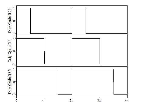 The following illustration shows the course of the function over two periods for different duty cycles: