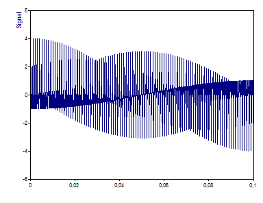 The x (time) values vary from 0 to 0.1 with a 0.0001 sample increment. The Nyquist frequency is thus 5000 (half the 10000 sampling frequency). The four reference sinusoids span the Nyquist range. The first low power sinusoid (-40 dB) has 1 % of the amplitude and 0.01 % of the power of one of the reference sinusoids. The next low power sinusoid (-50 dB) has 0.001 % of the power of the references. The last of the test sinusoids (-60 dB) has only 0.1 % of the amplitude and 0.0001 % of the power of the reference sinusoids. Gaussian Noise at 0.15 % was added to create a white noise floor at about -75 dB. It should thus be possible to resolve even the -60 dB component given a well designed spectral analysis.