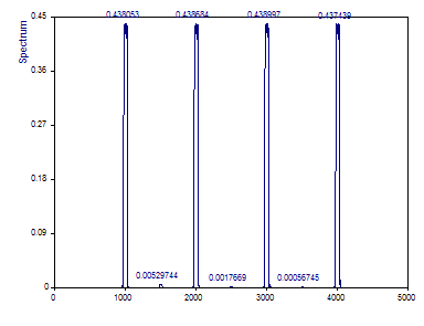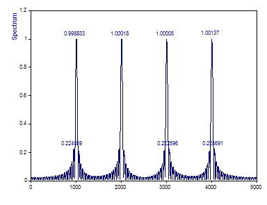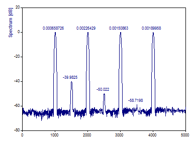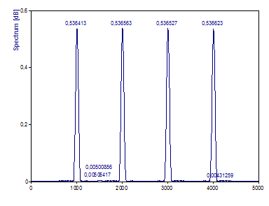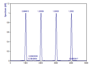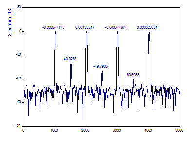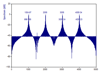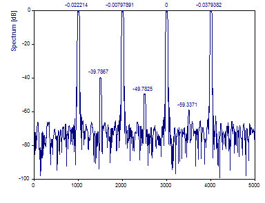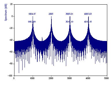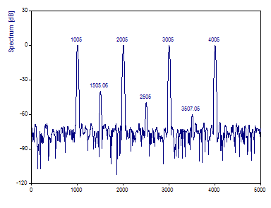 The FFT computation uses the fastest available FFT algorithm that exactly transforms the data. In this instance, the Prime Factor FFT algorithm is used since it is the fastest FlexPro FFT procedure that exactly processes the data size of 1001. The Fourier spectrum that is produced readily detects the four reference peaks. The -40 dB peak is observed. There is only a hint of the -50 dB peak and no evidence of the -60 dB peak. Even though FlexPro uses a cubic spline bin interpolation to refine the FFT peak frequencies, the reference frequencies of 1005, 2005, 3005, and 4005 are not exactly recovered.