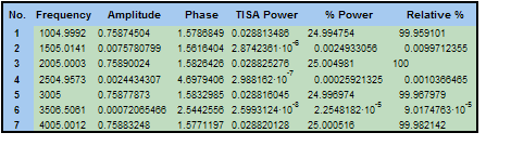 "HarmonicAnalysis" is a table of the spectral information for the seven narrowband components specified by the Maximum peak count of 7. The table displays frequency, amplitude, phase, and TISA power. The "% Power" sums the components to 100 %, the "Relative %" assigns 100 % to the component with greatest power.