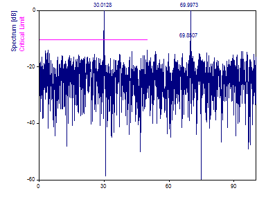 Note that the spectrum now recovers the 30 and 70 frequency components.