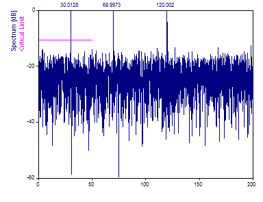 This data set contains three spectral peaks, one at a frequency of 30 (amplitude 100, phase 3π/2), another at a frequency of 70 (amplitude 100, phase π), and a third peak at the frequency of 120 (amplitude 100, phase π/2). The average Nyquist frequency is 50.05. There are thus two peaks beyond the average Nyquist limit.