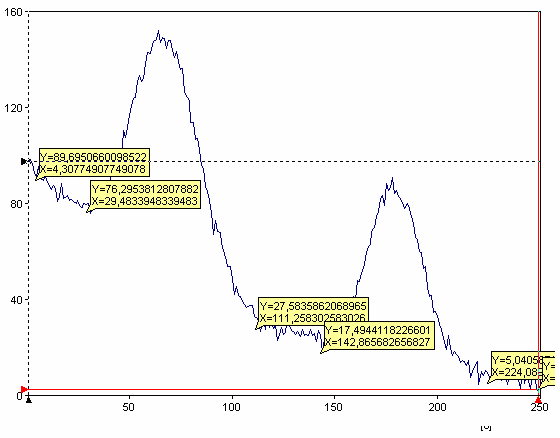 In this method, you can select the precise points to be used for determining the baseline. To do this, select Manually. Now the cursor will be activated in the diagram view. Use the cursor to move to the first point of the baseline to be calculated. Set a marker (Enter key). Repeat this process until you have marked a sufficient number of points. The points must not be on the curve. If you disable the option Bind Cursor To Curve you can also select points next to the curve.