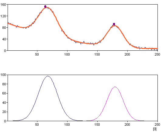 On page 2 of the Wizard, select Gauss Model (Variant 2) as the Model, 1000 as the Maximum number of function calls, automatic calculation, 2 for the Number of peaks, 10 for the Hysteresis, Maxima for the Type and then select the Peak curves option.