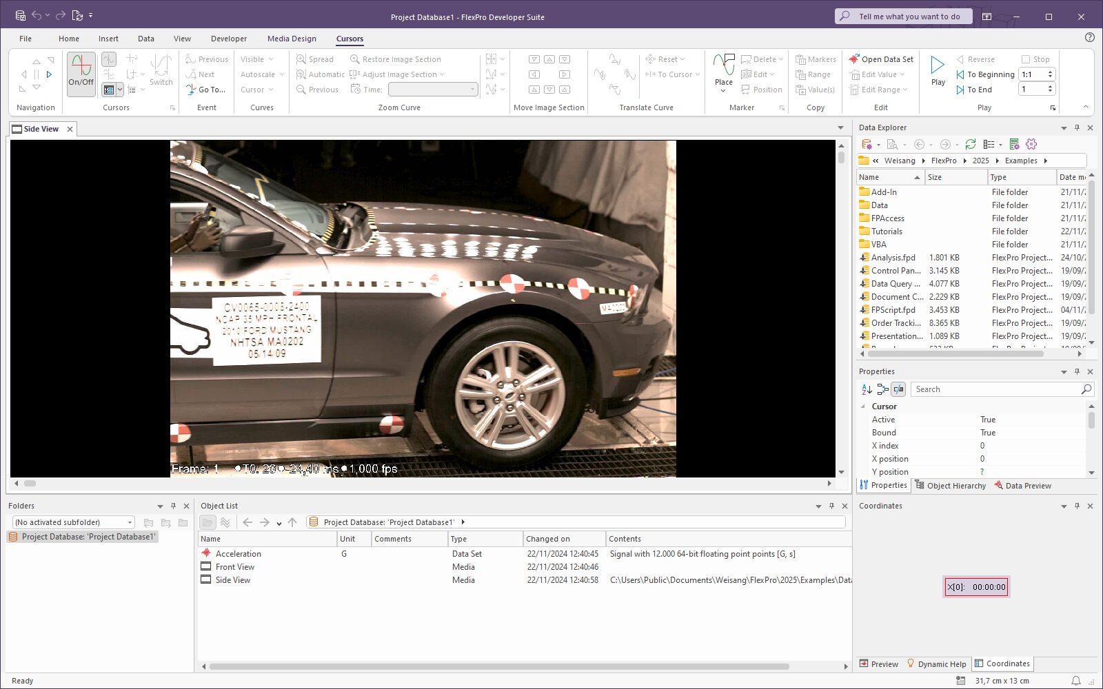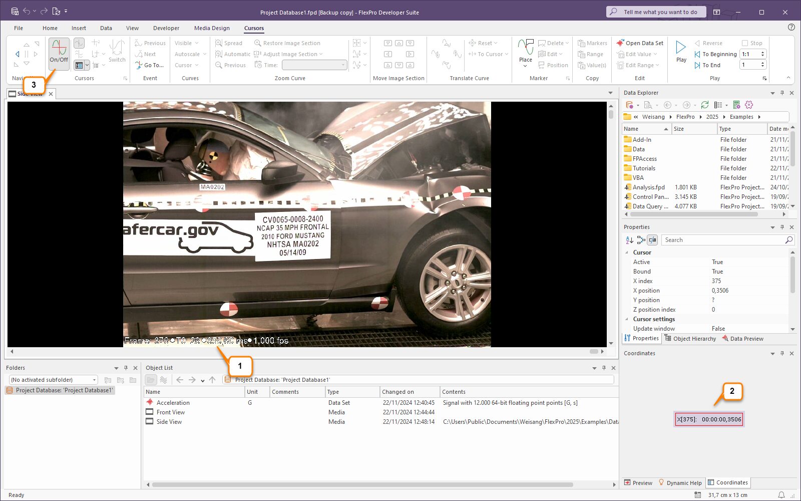 2.Now click on an event in the signal, such as on the point with the maximum delay, to position the cursor. FlexPro synchronizes the videos and displays the corresponding still images.