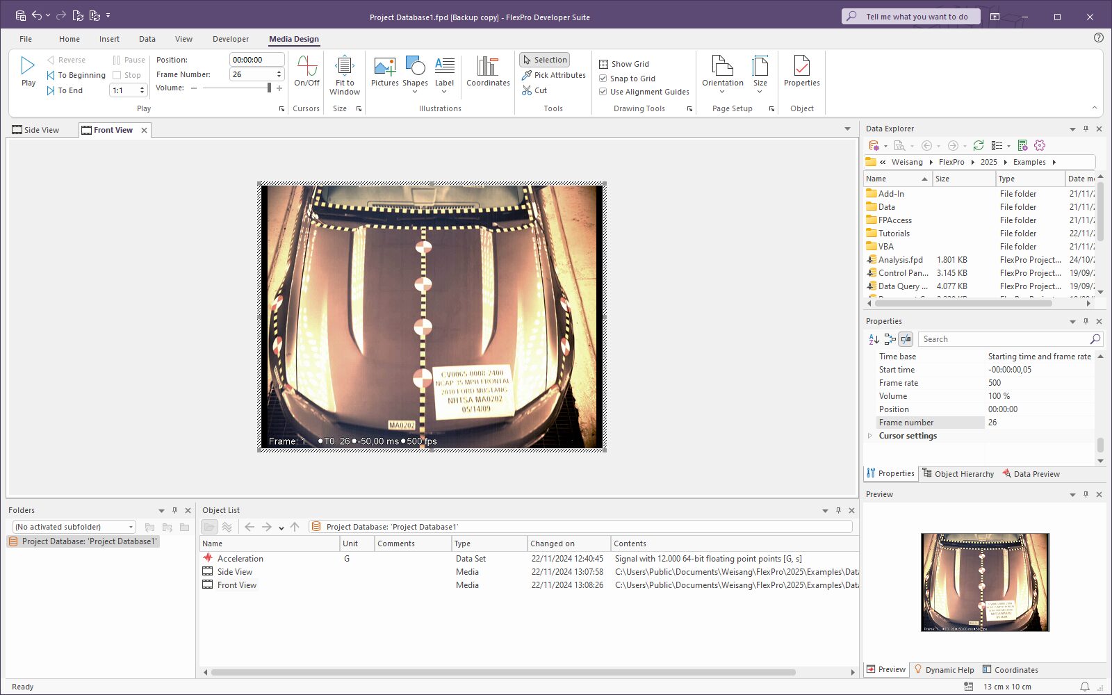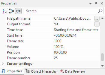 The second video called Front View was recorded at a rate of 500 fps, and the first frame is assigned the time -50 ms. You can now repeat the steps above for practice or select the media file called Front View in the object list and then in the Properties window you can change the Time Base to Starting time and frame rate and the two values in the Frame rate and Starting time fields.
