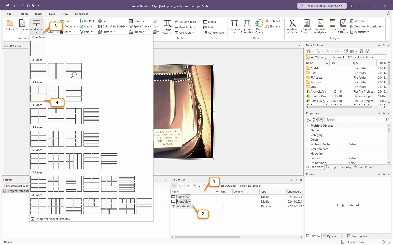 2.Click Insert[Containers] > Worksheet [3] and choose the first entry with three areas [4].