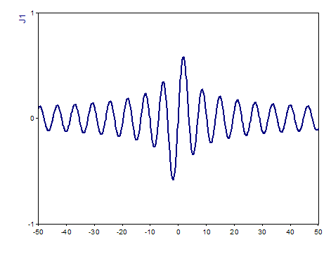 La función real de Bessel se calcula para un argumento real. El resultado tiene entonces el tipo de datos número en coma flotante de 64 bits. El siguiente gráfico muestra el curso de la función en el intervalo [-50, 50]: