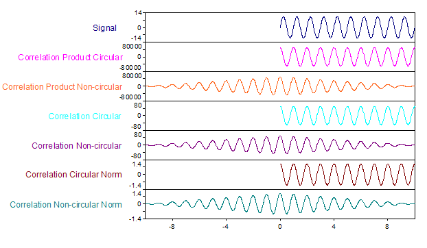 En la correlación circular, el cálculo se basa en la suposición de que uno o más períodos completos de una señal periódica están almacenados en el conjunto de datos o en ambos conjuntos de datos. Para la correlación cruzada, ambos conjuntos de datos deben tener el mismo número de valores. El resultado también tiene este número de valores. Si el resultado tiene un componente X, contiene el desfase temporal τ de la función de correlación. En la autocorrelación, el valor τ = 0 está siempre al principio de la serie de datos X. Por lo tanto, aquí no se calcula ninguna τ negativa. Sin embargo, debido a la periodicidad de la autocorrelación, los valores de la segunda mitad del resultado también pueden interpretarse, en este caso, como τ negativo.