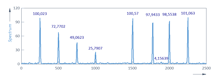 La mayor diferencia es reconocible en los componentes sexto y séptimo. Debido a la reducción de la resolución de frecuencia, ahora hay un claro solapamiento entre los componentes. El resultado del desplazamiento de 2,5 Hz es una amplitud del espectro cruzado que se reduce en menos de un tercio. Incluso el desplazamiento de 25 Hz provoca una reducción de la amplitud del espectro cruzado de menos de la mitad de la amplitud que se habría generado con frecuencias completamente idénticas.