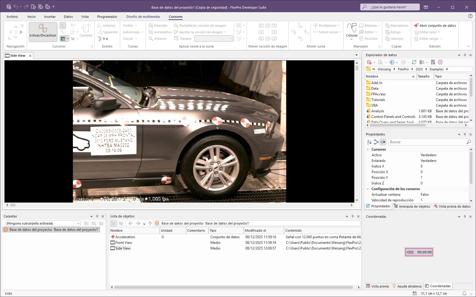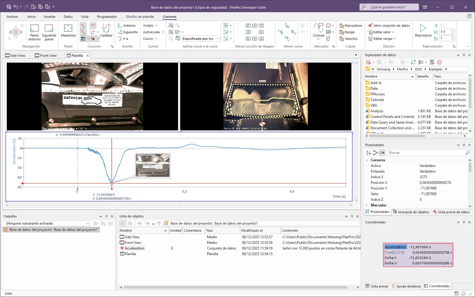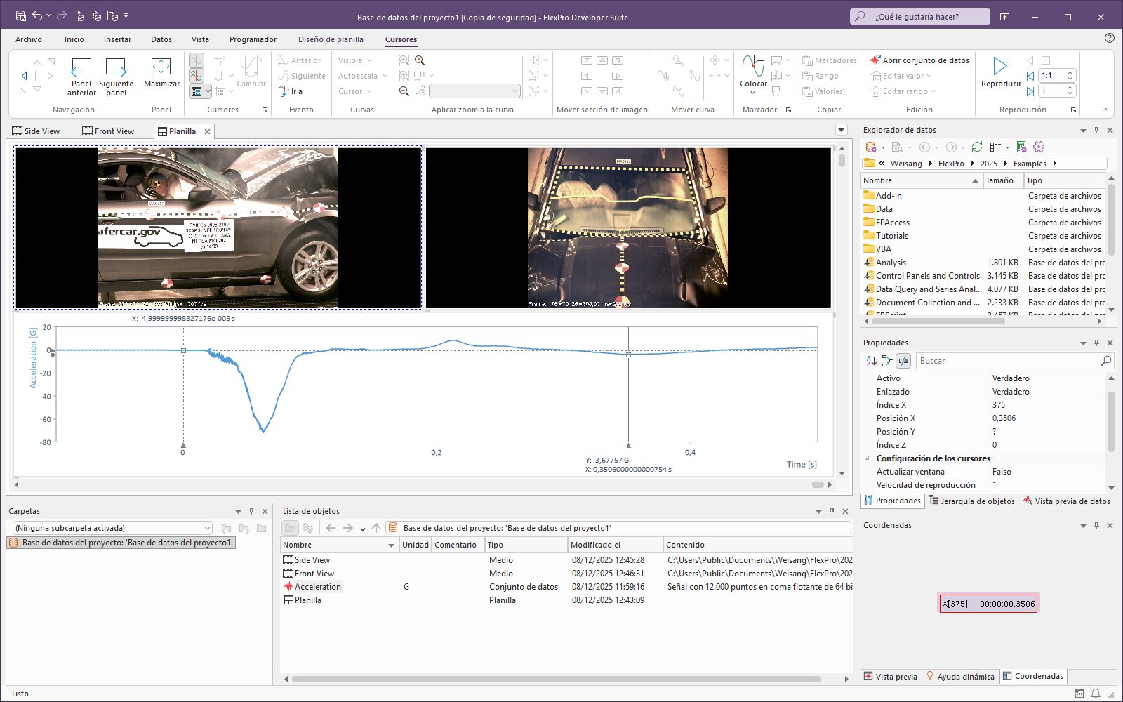 FlexPro importa los dos vídeos como medios y los datos de medición como un conjunto de datos.