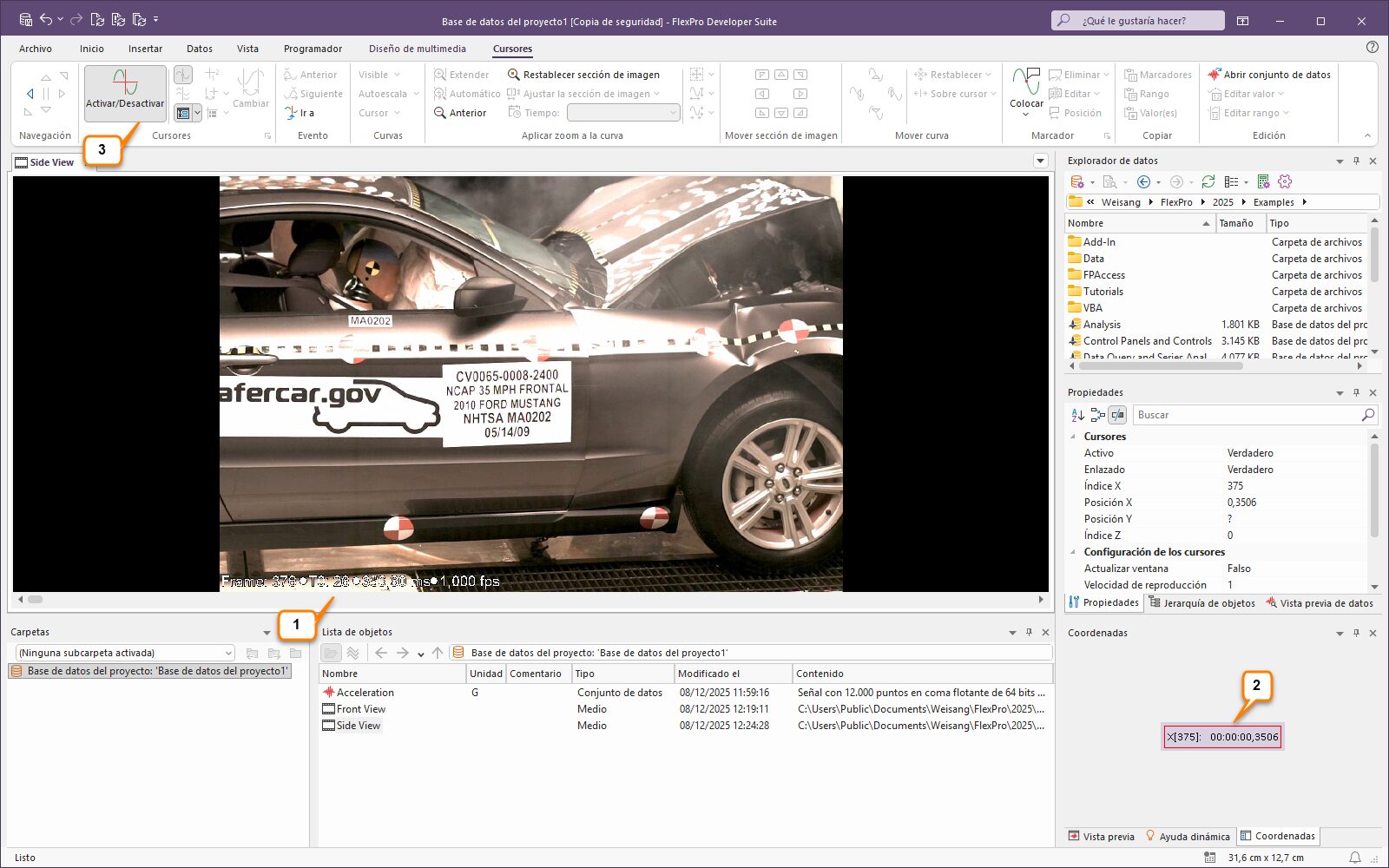 La imagen aparece en el vídeo con el número 376 y el tiempo asignado es de 350,60 ms [1]. La ventana de coordenadas de FlexPro muestra x[375]: 00:00:00,3506 [2]: