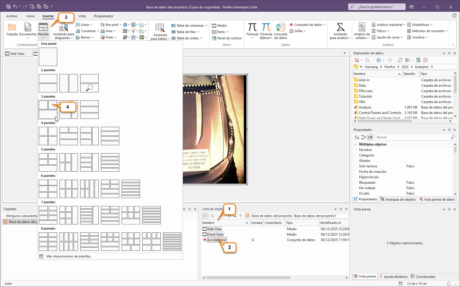 3.Cambie a la carpeta C:\Users\Public\Documents\Weisang\FlexPro\2025 o C:>Usuarios>Acceso público>Documentos públicos>Weisang>FlexPro>2025. Desde allí, vaya a la subcarpeta Video Analysis y seleccione los dos archivos de vídeo Side View.avi y Front View.avi y el archivo de datos de medición Acceleration.fpf.