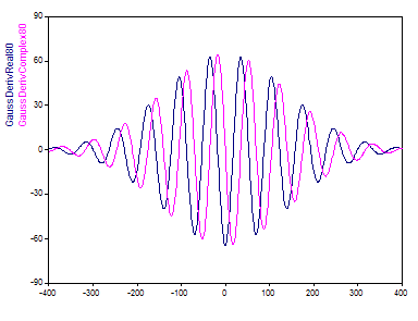 La tercera ondícula admitida por FlexPro es la ondícula derivada gaussiana. La parte real se define del siguiente modo: