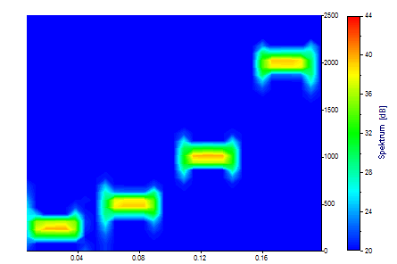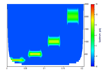 El siguiente conjunto de datos contiene una secuencia de oscilaciones senoidales de la misma potencia con un ruido del 1 %. En el intervalo de tiempo de 0,01 a 0,04 hay una frecuencia de 250 Hz, de 0,06 a 0,09 una frecuencia de 500 Hz, de 0,11 a 0,14 una frecuencia de 1 KHz y en el intervalo de 0,16 a 0,19 una frecuencia de 2 KHz.