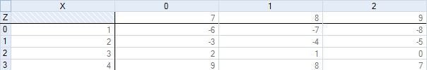 Calcula la función y = x^2 - z en la cuadrícula abarcada por las series de datos {1, 2, 3, 4} (en la dirección X) y {7, 8, 9} (en la dirección Z):
