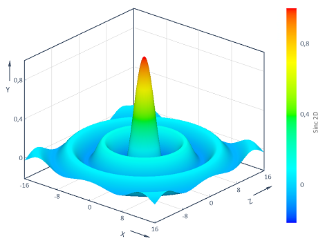 Calcula la función Sinc bidimensional y = f(x, z) = Sinc(Sqrt(x^2 + z^2)) sobre el área bidimensional (x, z)[-16, 16] x [-16, 16]. La visualización en un diagrama de contorno 3D proporciona: