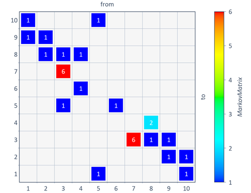 Los tipos de DataSet y ClassLimits deben ser iguales. Si no es así, se ajustarán entre sí. Si se especificó una serie de datos como conjunto de datos, el resultado es una matriz de datos de valores enteros de 64 bits con la matriz de Markov. Las filas de la matriz (índice en dirección X) corresponden a las clases "de" de las transiciones y las columnas, a las clases "a". Si DataSet se especificó como señal, el resultado es una serie de señales con un componente Z cuyos componentes X y Z contienen los puntos medios de clase resultantes de los límites de clase.