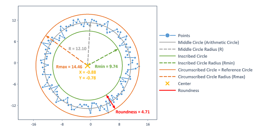 Calcula el círculo exterior más pequeño (MCCI) de un conjunto de puntos. Como resultado, se emiten el radio del círculo calculado y la redondez en forma de lista.