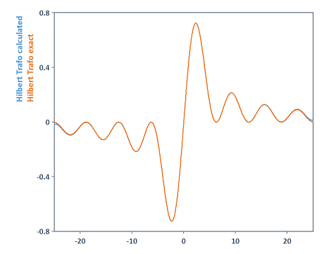 En este ejemplo, si se aumenta la longitud de la FFT al calcular la variable hilbTrafo al valor 131072, por ejemplo, se obtiene un resultado de cálculo más preciso para la transformada de Hilbert. Ahora ambas curvas son casi idénticas:
