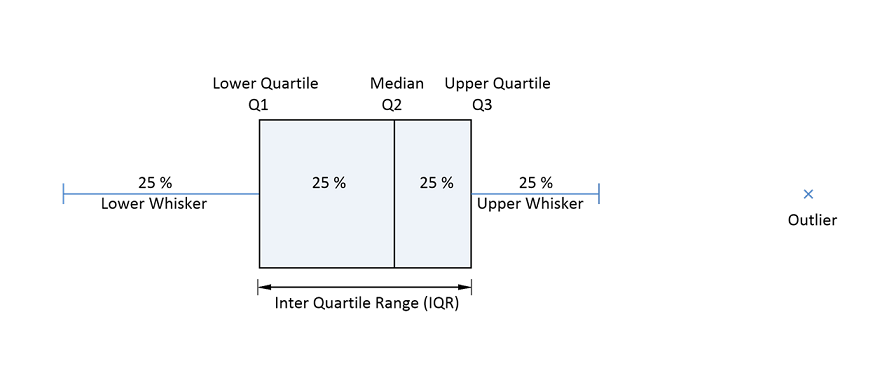 La caja corresponde a la zona en la que se encuentra el 50 % medio de los datos. Por tanto, está limitada por los cuartiles superior e inferior. La longitud de la caja corresponde al rango intercuartílico (IQR). Es una medida de la dispersión de los datos, que viene determinada por la diferencia entre los cuartiles superior e inferior. La mediana también se muestra como una línea continua en la caja. Esta línea divide todo el diagrama en dos zonas, cada una de las cuales contiene el 50 % de los datos.
