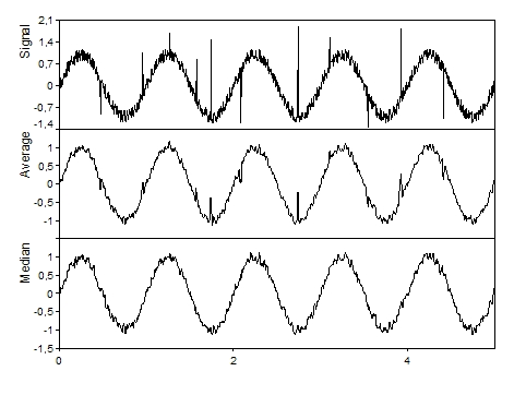 La función Quantile es adecuada para realizar un filtro de mediana. Para ello, utilice la función con Alpha = 0,5 y en modo CALC_MOVING. Un filtro de mediana suaviza una señal de forma similar a una media móvil, pero muestra un mejor comportamiento con señales con valores atípicos. Los valores atípicos individuales influyen mucho en la media, pero poco en la mediana. El siguiente gráfico muestra las diferencias: