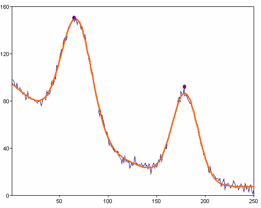Seleccione en la 2.ª página del asistente el Modelo gaussiano (variante 2), 1000 como Nº máximo de llamadas de la función, Cálculo automático, Número de picos 2, Histéresis 10, Tipo Máximos y active la opción Curvas Peak.