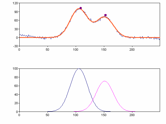 En esta página se realiza el ajuste de curva no lineal. Seleccione el Modelo gaussiano (variante 2), 100 como Nº máximo de llamadas a la función y el método de cálculo manual. En este caso, hay que establecer los picos colocando marcadores, igual que al determinar la línea de base. En este caso, define 2 picos.