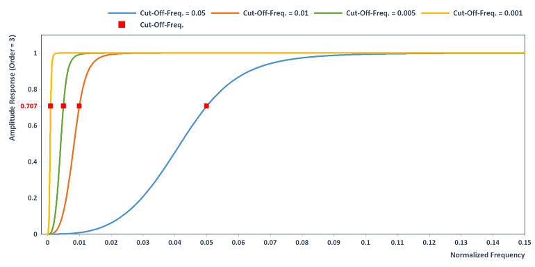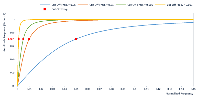 Le filtre a la réponse en amplitude suivante (Order = 1) pour différentes fréquences de coupure. La composante continue est filtrée et les fréquences supérieures à la fréquence de coupure sont transmises presque sans atténuation :