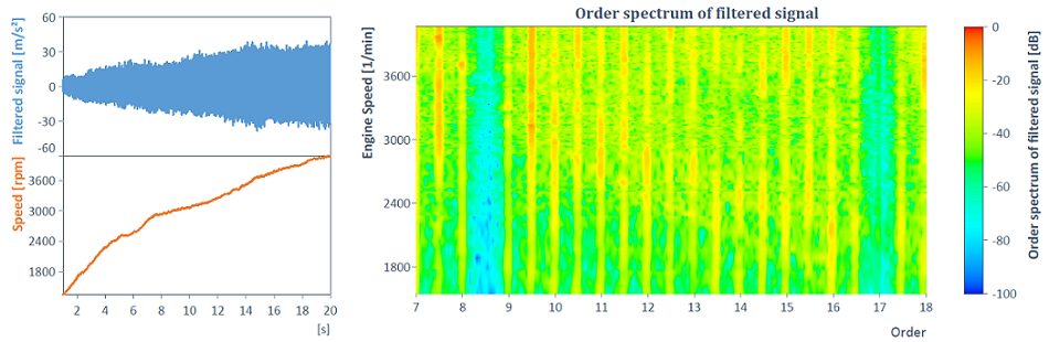 En utilisant l'objet d'analyse Filtre harmonique, l'ordre 8.5, par exemple, peut être supprimé avec toutes les composantes harmoniques :