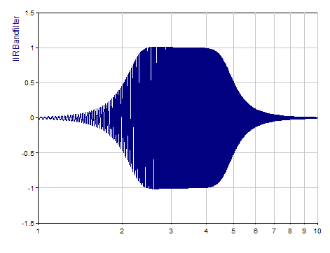L'illustration suivante montre un signal à fréquence balayée, qui a été filtré à l'aide d'un passe-bande Butterworth du quatrième ordre. Dans la représentation logarithmique en X, les deux pentes apparaissent aussi raides l'une que l'autre :