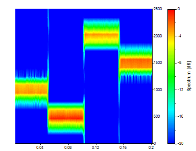 Ces paramètres produisent sept instantanés temporels, chacun d'une durée de 0,05 seconde. Il existe 129 fréquences. Alors qu'il y a une définition nette des composantes aux fréquences de 500, 1000, 1500 et 2000, la nature séquentielle des quatre harmoniques est obscurcie par la très mauvaise définition dans le temps. De plus, comme le temps attribué à un instantané est le temps moyen dans le segment, il y a une zone appréciable aux deux bornes temporelles où aucune information spectrale n'est disponible.