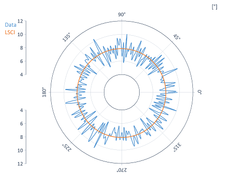 Le calcul du cercle de référence LSCI est basé sur la fonction LeastSquaresCircle. Le cercle LSCI est calculé comme le cercle auquel la somme des carrés des écarts par rapport aux données devient minimale. Dans la littérature de référence, on parle de cercle de Gauss. Le cercle inscrit est alors fourni comme le cercle inscrit maximum par rapport au centre du cercle LSCI. Le cercle de référence est fourni comme le cercle circonscrit minimum par rapport au centre du cercle LSCI. Le cercle circonscrit correspond au cercle de référence, c'est-à-dire le cercle LSCI.