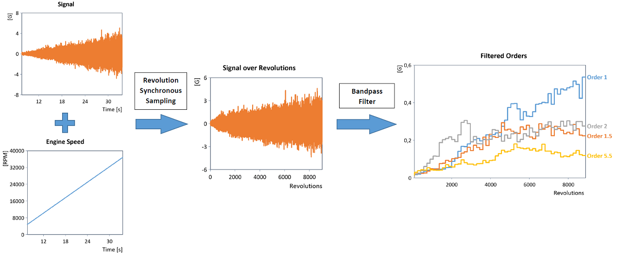 L'objet d'analyse Échantillonnage synchrone en révolution transforme un signal échantillonné dans le temps dans le domaine de révolution. Le signal n'est alors plus disponible par pas temporels équidistants, mais par pas d'angles de rotation équidistants (c'est-à-dire par intervalles de rotation équidistants). Dans la littérature de référence, on parle d'échantillonnage angulaire synchrone, de suivi d'ordre calculé, d'échantillonnage synchrone ou même de rééchantillonnage adaptatif.