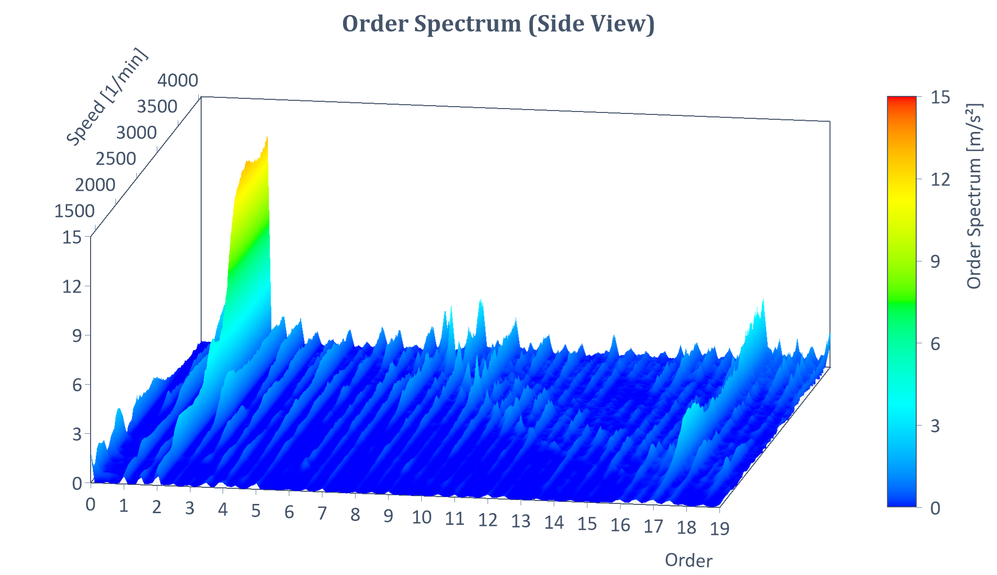 Exemple de spectre d'ordre RMS d'une montée en vitesse (avec Y = amplitude, X = ordre, Z = vitesse) :