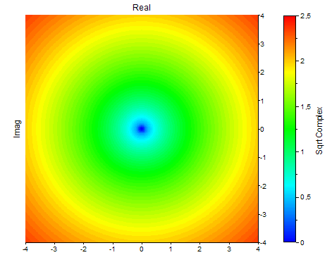 Si Number est complexe, alors la fonction de racine carrée complexe est calculée. Le résultat a alors le type de données valeur complexe à virgule flottante de 64 bits. L'illustration suivante montre la variation de la valeur absolue de la fonction :