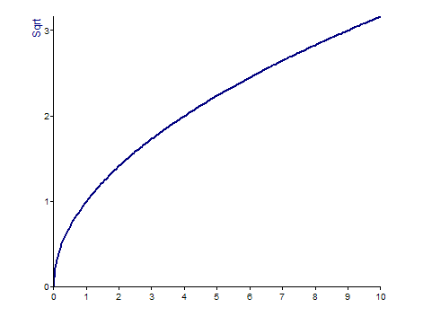 Pour obtenir un argument réel, on calcule la fonction racine carrée réelle. Number doit alors être positif. Pour chaque valeur négative Number, la fonction renvoie une valeur invalide (void). Le résultat est du type de données à virgule flottante de 64 bits. L'illustration suivante montre la variation de la fonction :