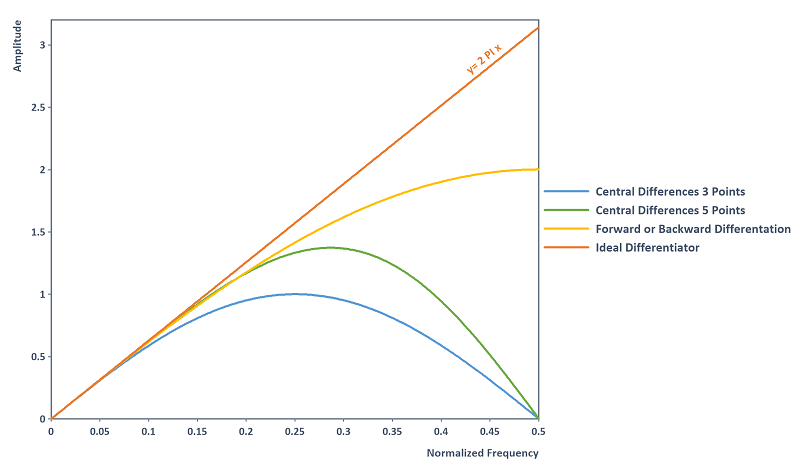 Observation : la règle centrale à 3 points ainsi que la règle centrale à 5 points suppriment le bruit à haute fréquence dans le domaine de la limite de Nyquist 0,5. La règle centrale à 5 points possède une approximation de la réponse en amplitude du différentiateur idéal plus précise que la règle centrale à 3 points dans toute la gamme de fréquences. Les quotients différentiels unilatéraux vers l'avant et vers l'arrière possèdent certes une approximation plus précise de la réponse en amplitude du différentiateur idéal, mais ils amplifient ainsi le bruit à haute fréquence. Il convient de noter que les règles centrales de différence ont une réponse de phase constante de 90 degrés et correspondent donc exactement à la réponse de phase du différentiateur idéal. D'autre part, les quotients de différence en avant et en arrière ont un déphasage linéaire.
