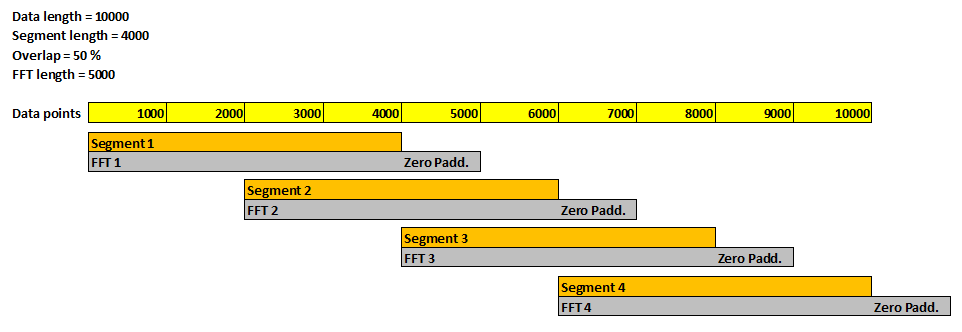 Le graphique suivant visualise les réglages de la longueur des segments, du recouvrement et de la longueur de la FFT :