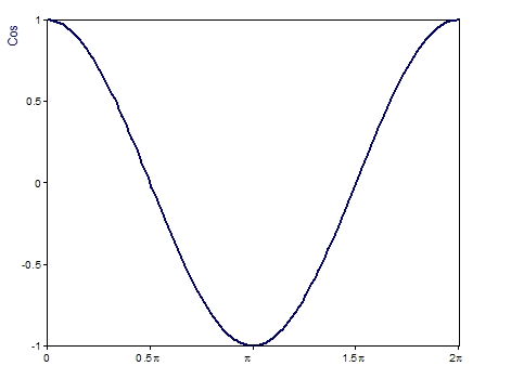 La fonction cosinus réelle est calculée pour un argument réel. Le résultat a alors le type de données valeur à virgule flottante de 64 bits. L'illustration suivante montre la variation de la fonction :