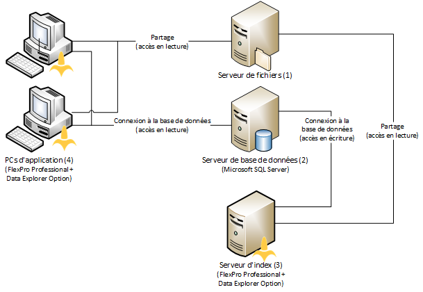Les fonctions de serveur de fichiers, de base de données et d'index peuvent être configurées sur un seul ordinateur Windows ou sur des ordinateurs séparés.