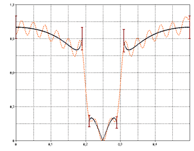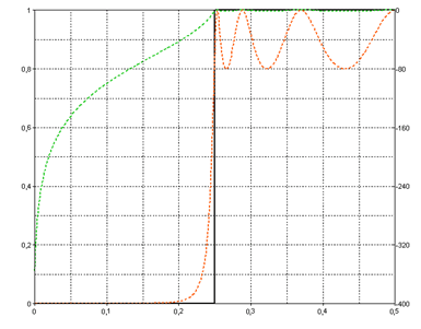 Il est également possible de ne définir qu'une seule bande sur toute la gamme de fréquences de 0 à 0,5. Cependant, il faut s'assurer que les bandes individuelles ne présentent pas de points de discontinuité, sinon l'algorithme ne peut pas converger. En principe, on peut dire que la conception du filtre à l'aide d'une réponse d'amplitude prédéfinie est très gourmande en calculs si la longueur du filtre doit être calculée. De plus, en fonction de la spécification prédéfinie, l'algorithme peut ne pas converger très bien. Dans ce cas, les erreurs d'approximation sont augmentées ou les fréquences de coupure des bandes sont modifiées.