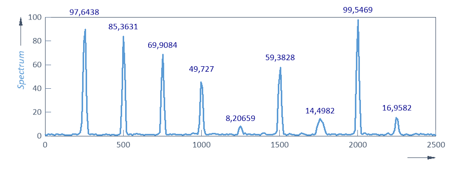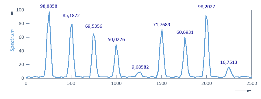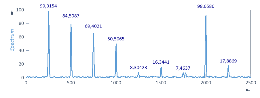 Comme il est typique, les pics ne sont pas centrés dans les canaux de Fourier, et le déplacement de l'harmonique par rapport au centre du canal n'est pas constant. Lorsque le déplacement est le plus faible, les amplitudes sont les plus élevées. Notez également que le fenêtrage entraîne la propagation d'une partie de l'information spectrale aux canaux adjacents. C'est pourquoi les amplitudes dans les canaux de crête ne représentent qu'environ 75 % des amplitudes réelles des harmoniques.