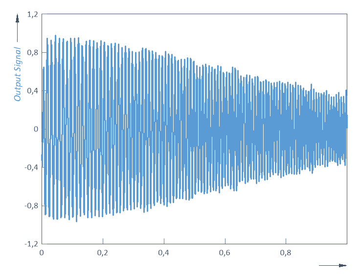 Nous avons généré un ensemble de données avec 1000 valeurs réelles dont l'amplitude diminue lorsque la fréquence augmente. La fréquence de coupure de 100 Hz est atteinte exactement au milieu de notre signal d'entrée chirp. Là, comme prévu, l'amplitude du signal renvoyé est amortie d'environ -3 dB.